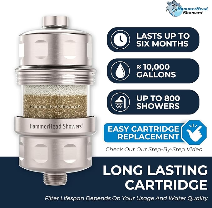 - HIGH OUTPUT CARTRIDGE – This chlorine shower filter has a large cartridge rated for 6 MONTHS or 10,000 GALLONS of use. HASSLE-FREE REPLACEMENT: simply unscrew the housing, switch the old cartridge for the new one, and reattach the housing.
