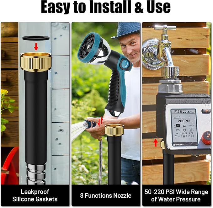 - Functional nozzles - Metal hose (3 feet, 5 feet, 10 feet, nozzle not included); The nozzle (included in the 25-foot, 50-foot, 75-foot, 100-foot hose) is equipped with an ergonomic non-slip rubberized handle. Use your thumb to turn on the switch to control the flow of water, no need to squeeze the trigger handle too hard so this kind of nozzle won't put pressure on your fingers.