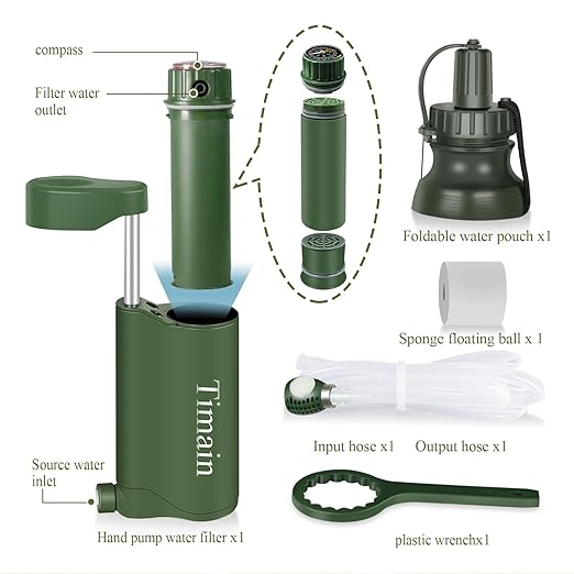 - Practical: Comes with the TIMAIN filter handpump,1 foldable water pouch, 1 Carrying Case, 1 plastic wrenchandextra Tubing and a compass.