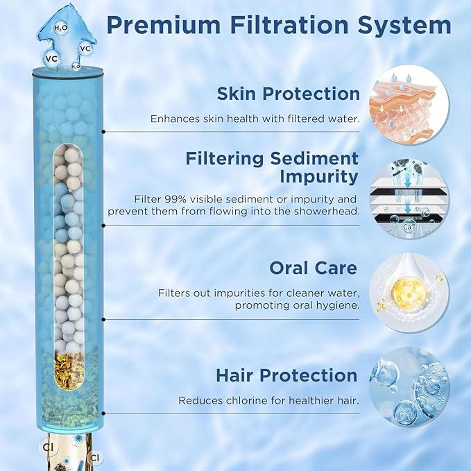- Dual Handheld Shower Head Combo Set with Filter: This showerhead combo includes a 8 inch rainfall handheld shower head and a 7-setting high pressure handheld showherhead. Unique pre-installed filter material in the 2 shower heads helps to filter and purify the chlorine, fluoride, heavy metals in the unfiltered water and improves the condition of your skin, hair and snail effectively
