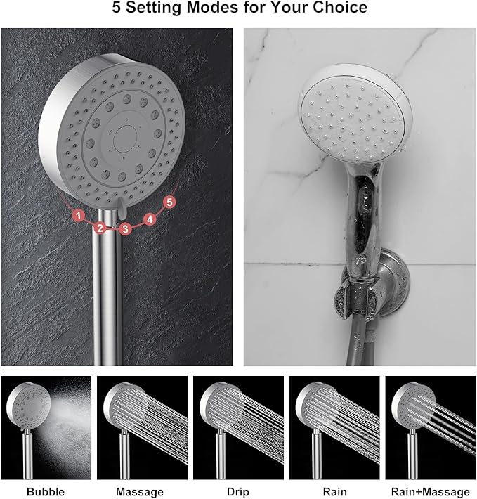 - STAINLESS STEEL 5 SETTING HANDHELD SHOWERHEAD: Its nozzle adopts Tpr and high-level Abs panel and SUS 304 handle. Creates a pressure-increasing stream and delivers water at a higher velocity to compensate for low water pressure situations. With 5 spray patterns, not only provide you with a luxurious shower experience but is also suitable for baby shower, pet shower. With a 59" SUS 304 hose and 2-in-1 shower head holder Each handheld showerhead has a flow rate of 1.8 gallons per minute (GPM).
