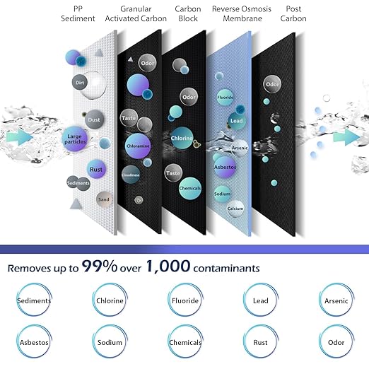 - [Purify Water Effectively] Employing a 5-stage filtration mechanism, iSpring RCC7 eliminates upwards of 99% of over 1,000 detrimental contaminants, including PFAS, chlorine, fluoride, lead (with a removal rate of up to 98%), arsenic, asbestos, calcium, sodium, and more. Moreover, this under-sink water filtration system effectively reduces the Total Dissolved Solids (TDS) rate, rendering it perfect for drinking. Additionally, it removes hard water minerals such as calcium and magnesium, which often result in white residue or scale to generate delicious-tasting water that's clean, safe, and optimal for consumption