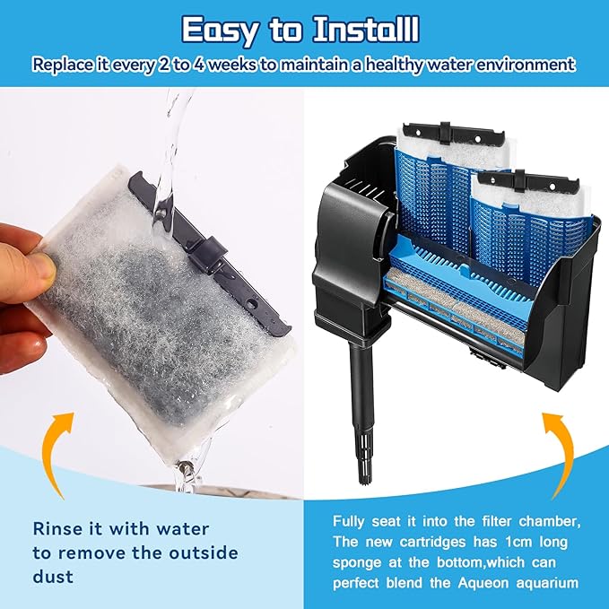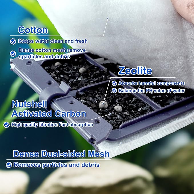 - 【Four-Stage Filtration】The filter is made of dense dual-sided mesh, the better the filtration effect. With 25% more active activated carbons and zeolites are added to effectively filter and absorb impurities in water, maintain a clean water source, and provide a healthy growth environment for fish.
