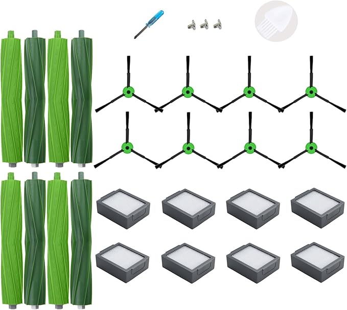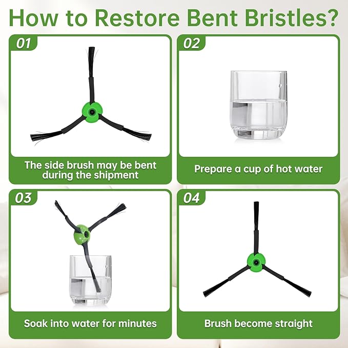 - Value Pack: 8 * multi-surface rubber roller brush, 8 * high-efficiency filters, 8 * edge sweeping brushes, 1 * cleaning brush, 1 * screwdriver (If the side brushes are bent from shipping, simply soak them in warm water for a while to restore them)