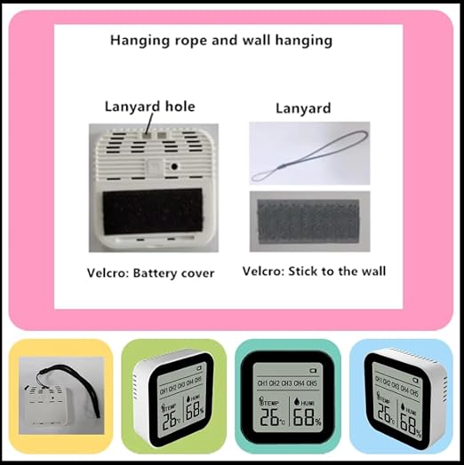 - 6.【 Sensor Multiple Mounting Options and Widely Use 】 : Room thermometer for home are available in various installation options: stand, wall mount, and paste mount. Using double-sided tape and suspension holes, you can paste or place room thermometer for home anywhere you like, such as refrigerator, counter, living room, baby room, kitchen, basement, office, greenhouse, guitar room, office, garden, and cellar. Sensor with lanyard and velcro .