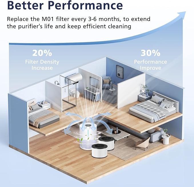 - 𝗪𝗮𝗿𝗺 𝗠𝗮𝗶𝗻𝘁𝗲𝗻𝗮𝗻𝗰𝗲 𝗧𝗶𝗽: To ensure your M01 Air Puri-fier runs at high performance, recommend replacing filters every 3- 6 months, also depending on your frequency of use.
