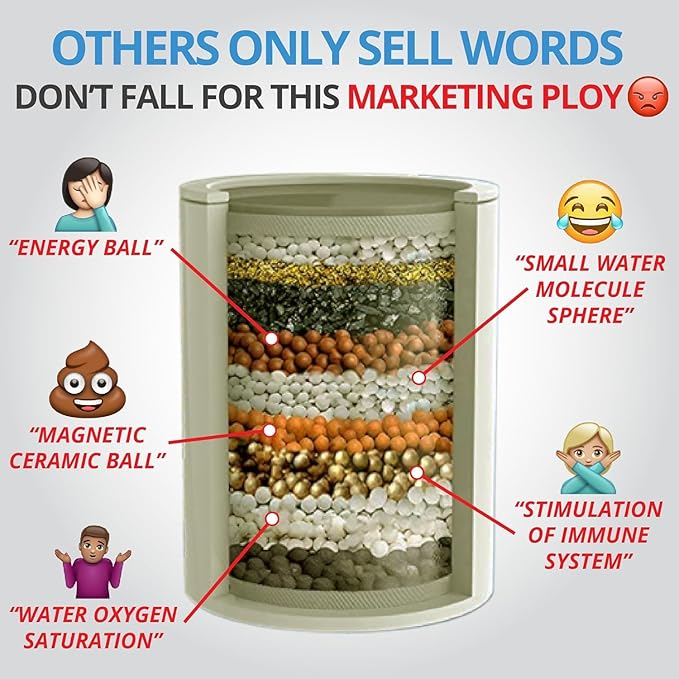 - NO BS HARD WATER SHOWER FILTER – Marketing gimmicks like energy and ceramic balls are just clay with no real function. We use 100% REAL filtration media—sediment, carbon, KDF, and calcium sulfite—for the best shower experience and a longer 6-month filter life.