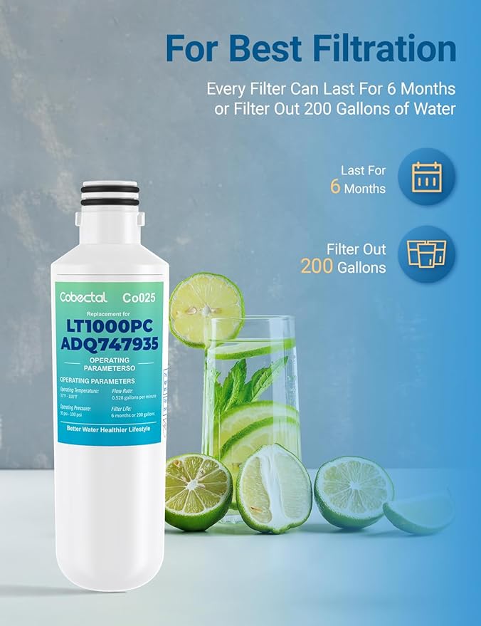 - NSF Certified - Rigorously tested by NSF to demolish 99% Chlorine, taste, odor, Heavy Metals and other impurities. Experience water so crisp, it’s like sipping from an alpine spring—even your ice cubes radiate purity. Enjoy better tasting, safer drinking water and ice cubes with Cobectal LT1000PC re/fri-gerator water filters