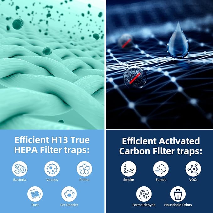 - 【H13 TRUE HEPA FILTER】: 3-in-1 True HEPA System High Efficiency Activated Carbon Filter, H13 Grade True HEPA Filter. Works 99.97% of airborne particles as small as 0.3 microns in size to attach, protecting your home from pet hair, pet dander and odors.