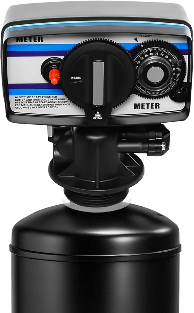 - CONVENIENT TO USE: Three knobs on the control panel make it easy to operate. You can set the water softening time and hardness as required to ensure optimum water softening while reducing salt and water consumption. It can automatically start the regeneration process according to the flow rate or time setting. You only need to add salt to the salt tank regularly, the rest of the work is done automatically by the water softener, saving time and effort