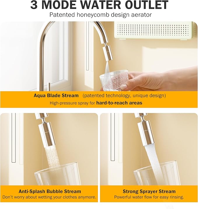- 【3 Water Outlet: Bubble Stream/Strong Flow/Aqua Blade】Frizzlife FD360 faucet aerator features a 3-mode system. The bubble stream mode is perfect for gentle rinsing or washing hands without splash. The strong flow mode is ideal for washing fruits and dishes and cleaning the sink. The unique feature is the aqua blade mode, which delivers a high-pressure spout for cleaning hard-to-reach areas, like the inner bottom of cup. You can easily switch between these functions by rotating the aerator.