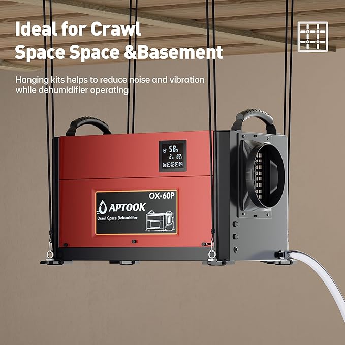 - Designed for Crawl Spaces: Measuring just 20.5″D x 14″W x 14″H, this unit comes with leveling feet and a joist hanging kit for secure installation. It can be hung using the joist hanging kit or placed on a level surface. Suspended from floor joists in crawl spaces, it effectively extracts humid air, eliminates moisture, and circulates fresh, dry air back into the space.