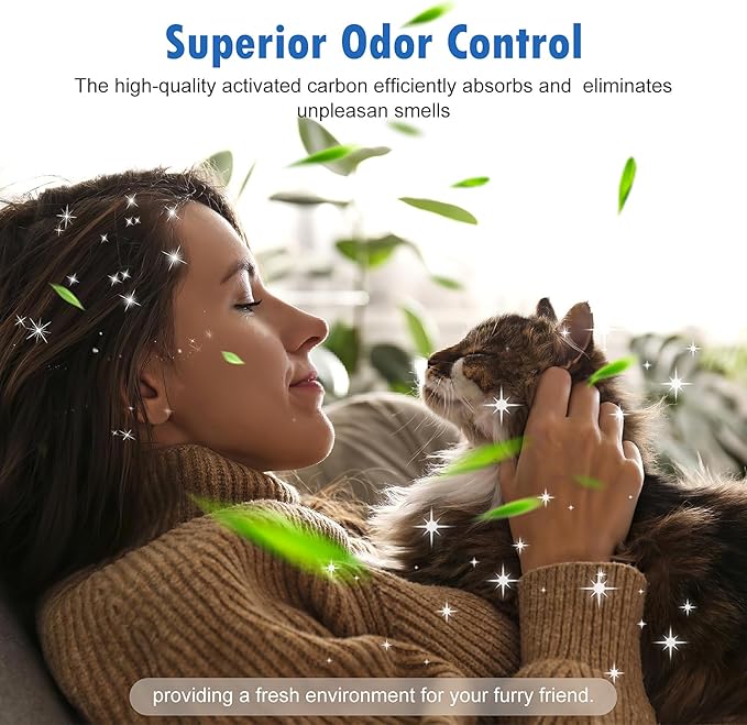 - 🐱[Eliminate unpleasant odors]: Our Cat litter box replacement filters are equipped with activated carbon and manganese sand, effectively adsorbing and filtering urine and fecal odors to maintain a fresh and clean scent in your home