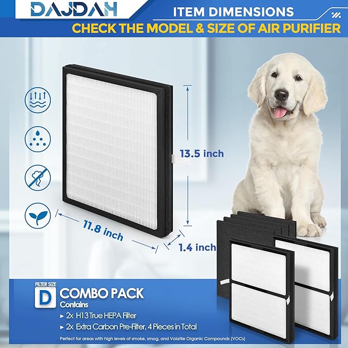 - [ 𝗛𝗜𝗚𝗛-𝗘𝗙𝗙𝗜𝗖𝗜𝗘𝗡𝗖𝗬 𝗛𝟭𝟯 𝗧𝗥𝗨𝗘 𝗛𝗘𝗣𝗔 𝗙𝗜𝗟𝗧𝗘𝗥 ]: DAJDAH IAF-H-100D HEPA Filter D is a high-performance particle filter. H13 True HEPA layer can completely capture 99.97% of particles, such as pet dander, fineDust, smoke particles, etc. Upgraded ActivatedCarbon pre-filter contains more high-quality carbon to absorb petOdors, smoke, cooking smells and AdverseVOCs, captures large particles in the air, effectively protecting and extending the life of the HEPA filter