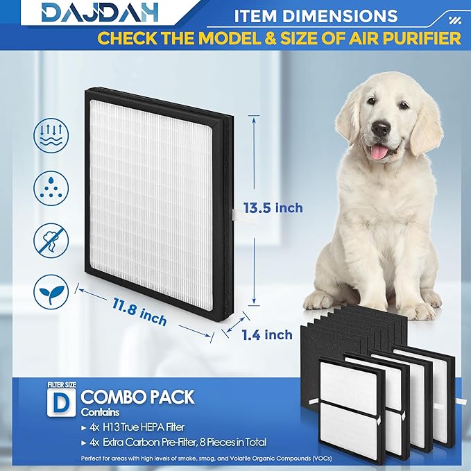 - [ 𝗛𝗜𝗚𝗛-𝗘𝗙𝗙𝗜𝗖𝗜𝗘𝗡𝗖𝗬 𝗛𝟭𝟯 𝗧𝗥𝗨𝗘 𝗛𝗘𝗣𝗔 𝗙𝗜𝗟𝗧𝗘𝗥 ]: DAJDAH IAF-H-100D HEPA Filter D is a high-performance particle filter. H13 True HEPA layer can completely capture 99.97% of particles, such as pet dander, fineDust, smoke particles, etc. Upgraded ActivatedCarbon pre-filter contains more high-quality carbon to absorb petOdors, smoke, cooking smells and AdverseVOCs, captures large particles in the air, effectively protecting and extending the life of the HEPA filter