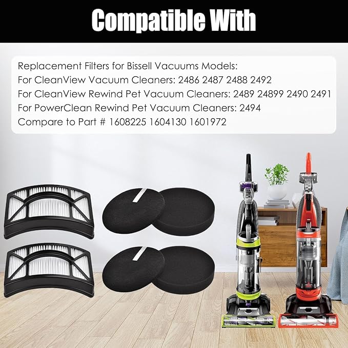 - 【Compatible Models】Replacement filters compatible with Bissell CleanView 2486, 2487, 2488, 2492 vacuum cleaners, also fit for Bissell CleanView Rewind Pet 2490, 2489, 24899, 2491, PowerClean Rewind Pet 2494 Vacuums. Compare to Part # 1608225, 1604130, 1601972.
