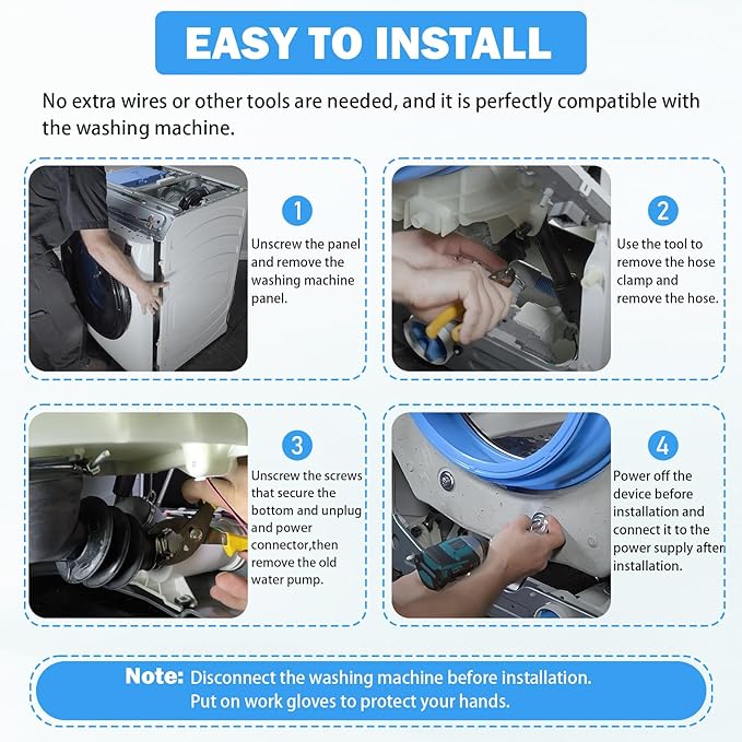 - PREMIUM QUALITY - Drain pump and filter assembly is made of high quality material, heat and wear resistance, more durable. It is very easy to install, no extra wires or other tools are needed, and it is perfectly compatible with the washing machine. If your washer does not drain and water still remains in the tub, you may need this TOVEN-RV WH11X29539 drain pump. Disconnect the washing machine before installing this replacement part. It's suggested to wear gloves to protect your hands.