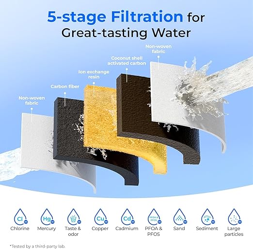 - [5-stage Filtration for Cleaner Water] This water filter pitcher adopts 5-stage filter materials including advanced carbon fiber, ion exchange resin and activated carbon block, and can efficiently reduce chlorine, mercury, taste&odor, copper, cadmium, PFOA&PFOS, sand, sediment and large particles, tested by a third-party lab, offering pure, refreshing water for you and your family. Note: This system DOES NOT lower TDS value.