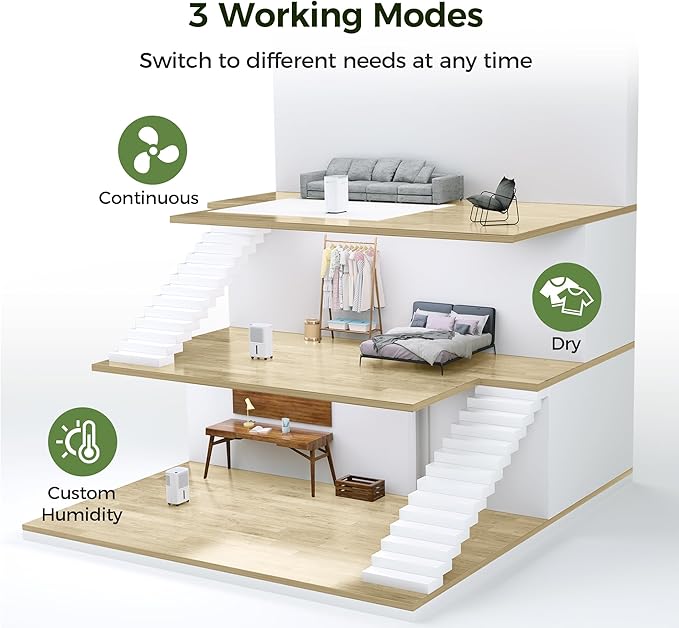 - šš«š¢š©š„š ššØšš ššš”š®š¦š¢šš¢šš¢šš«: Three modes to meet your different dehumidification needs. DEHU mode adjusts the humidity and fan speed from 30% to 80% according to your needs, which can keep the room at a healthy humidity level. DRY mode removes moisture from wet clothes. The CONTINUOUS mode will work until the humidity reaches your preset value suitable for very humid spaces.