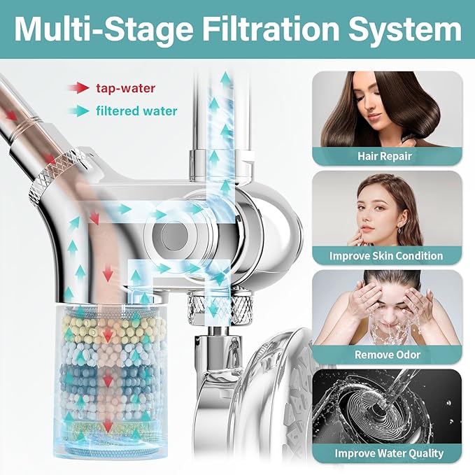 - 【Unique Magnetic Base】Our magnetic filtered shower head with handheld combo has a unique magnetic docking base. Its powerful magnetism can firmly attach the handheld shower head to the base without an additional shower bracket. Due to its magnetic attraction function, you can easily place and take the handheld shower head even with your eyes closed. In addition, the base can be swivelled 360°, making it easy to position the shower head at the suitable angle.