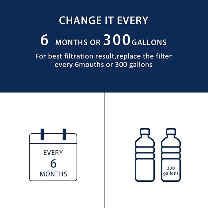 - Maintain Peak Performance & Taste: For optimal water quality and taste, replace this filter every 6 months or after filtering 300 gallons, whichever depends on the water condition. Regular replacement prevents clogging and ensures continued effective filtration