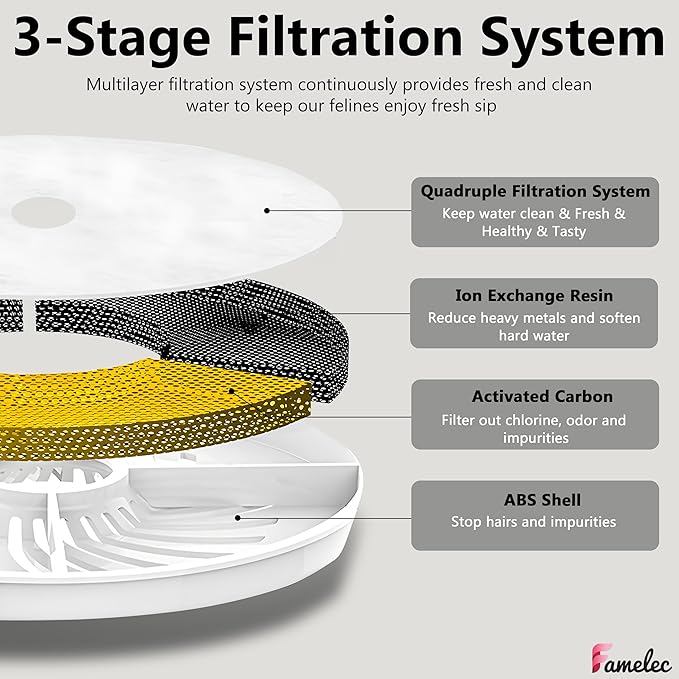 - π¦ Triple Filtration System: Our filters for Catit water fountain filter replacement is saturated filled with premium fiber cotton, activated carbon, and ion exchange resin, providing triple-action filtration to fully isolate pet hair and food residue, remove impurities and particle, filter heavy metals and odors, soften tap water and obtain clean and fresh water. The mesh material is also great in preventing any large debris from getting in the cat fountain water bowl, which keeps the cat water fresh and clean.