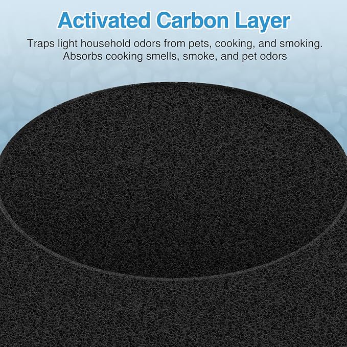 - 【High Efficient Filltering】:The HEPA filt-er Clean at least 99.97% of tiny airborne particles like smoke down to 0.1 microns, and cleans pet dander, and dust, The activated carbon filt-er cleans up light households from smoking, pets, and cooking fume