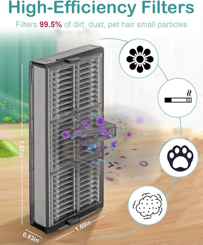 - 【PACKAGE INCLUDE】The replenishment kit Includes 2 pack multi-surface rubber brushes, 2 pack filters, 4 side brushes, 4 dust bags, 1 free tools. The products are made of high-strength and environmentally friendly materials to ensure optimal performance and a healthier lifestyle