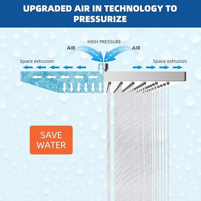 - High Pressure Shower Head: The Hibbent 10-inch shower head, with its air-in technology, provides a luxurious rain-like spray that envelops the body in a soothing, enveloping downpour. This dynamic, high-pressure massage experience is delivered even at low water pressure levels, while the chrome finish adds a sleek, modern elegance to your bathroom's decor
