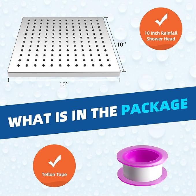 - High-quality Material: The large 10-inch rainfall shower head boasts a substantial, artfully crafted body of premium ABS plastic, complemented by a back panel of certified SUS 304 stainless steel. This material composition ensures the square fixed showerhead is rustproof, lightweight, and built to withstand the test of time, and it also has an excellent elegance and durability that will serve you for years to come