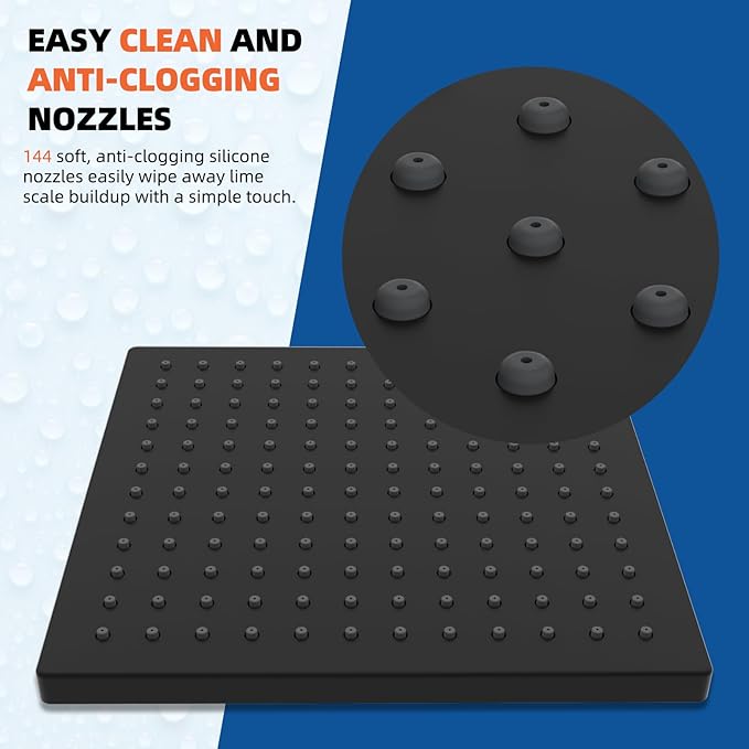 - Self-cleaning Silicone Nozzles: The rainfall shower head has 144 soft silicone nozzles, meticulously designed to prevent limescale buildup and clogging. These high-quality silicone nozzles not only ensure a safe and healthy bathing experience but also make cleaning a breeze. Wipe away any residue or buildup, and the self-cleaning properties of the silicone material will maintain the nozzles in pristine condition, ensuring an enjoyable shower every time