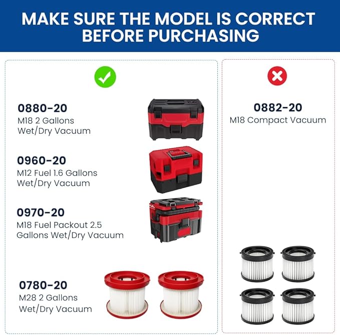 - Wide Compatibility: Compatible with Milwaukee 49-90-1900 filter, M18 and M12 Wet Dry vacuums, 0880-20, 0970-20, 0960-20, 0780-20 Note: NOT fit for M18 Compact vacuum 0882-20.