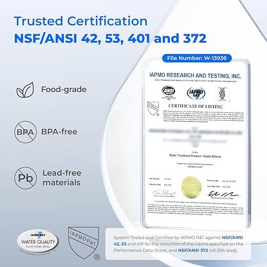 - NSF/ANSI Certified: The electric water filter dispenser has been certified by IAPMO against NSF/ANSI 401, 53, 42 and 372 standards to reduce over 45 contamintants, including chlorine, lead, microplastic, mercury, benzene and more. Third-party lab tests confirmed its capability to reduce PFOA and PFOS, thus ensuring high-quality drinking water.