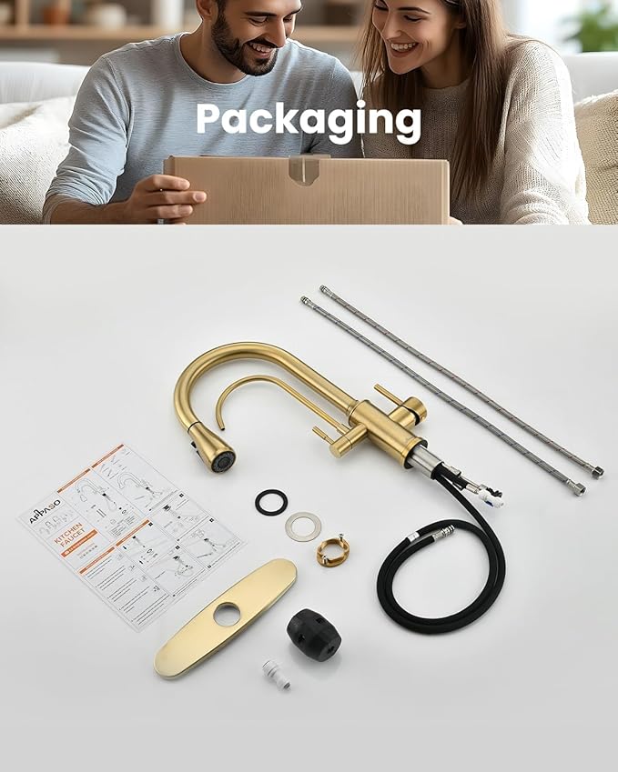 - Brushed Gold Kitchen Faucet: Upgrade your kitchen with 3 hole kitchen faucet, a versatile 3 in 1 water filter purifier faucets that combines hot & cold water functions with RO water capabilities. This single hole kitchen faucet is perfect for those seeking a convenient and space-saving solution