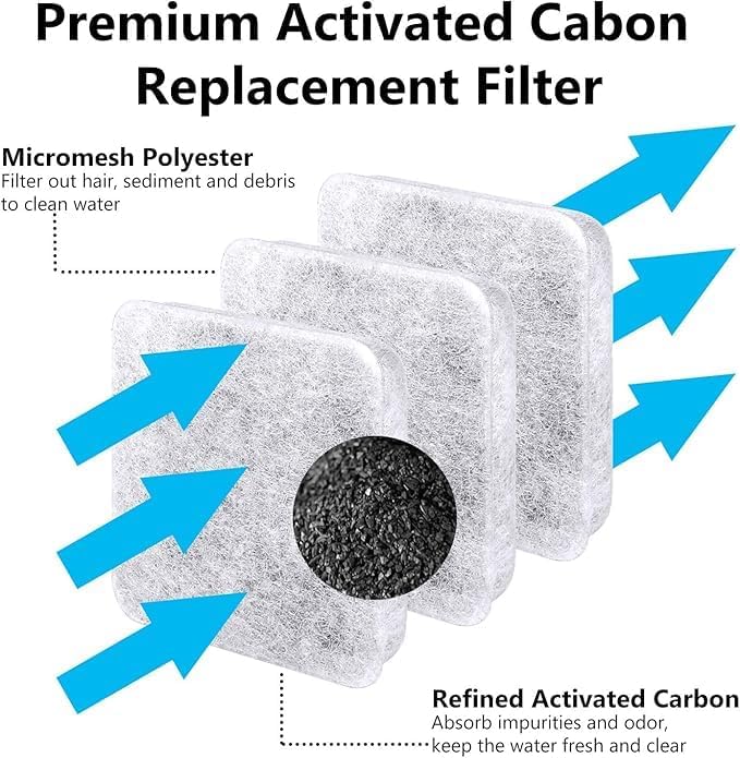 - ACTIVATED CHARCOAL:Finer charcoal granules on dog water filter increase the surface area exposure to water and maximize the effective filtration. The dog water dispenser make the most effective to remove odors from water,which is good for their health