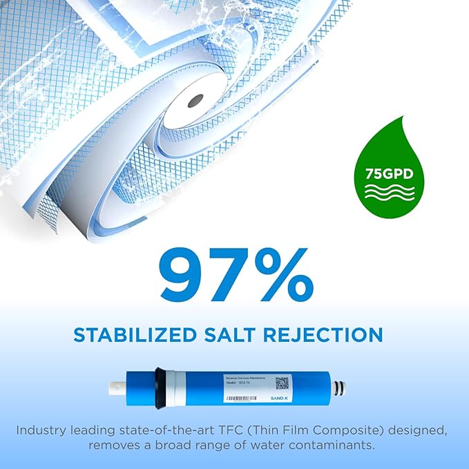 - 【SANDMONK 75 GPD RO Membrane】SANDMONK ro membrane produces 75 gallons purified water per day (about 3.1 Gallons/11.8 Liters per hour). Whether for drinking, cooking or making beverages, our ro membrane is convenience and will meet your daily hydration needs easily.
