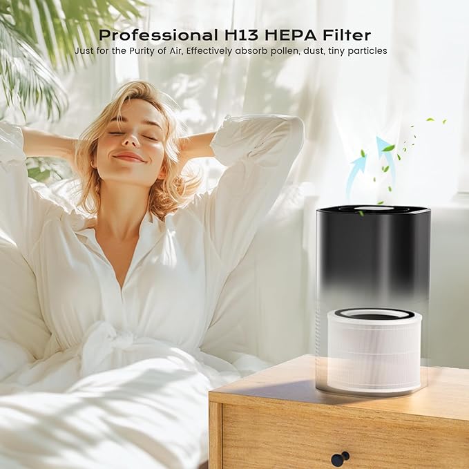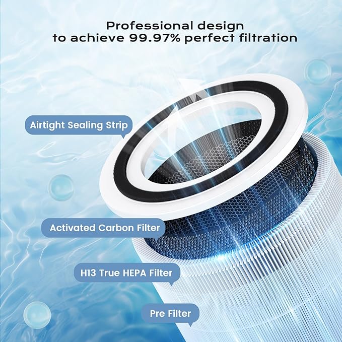 - 3-in-1 Filtration System: Features a high-performance 3-stage system: Combo a Fine Pre-Filter/ a 14 HEPA filter/ an Activated Carbon Layer. 99.97% of airborne particles as small as 0.3 microns