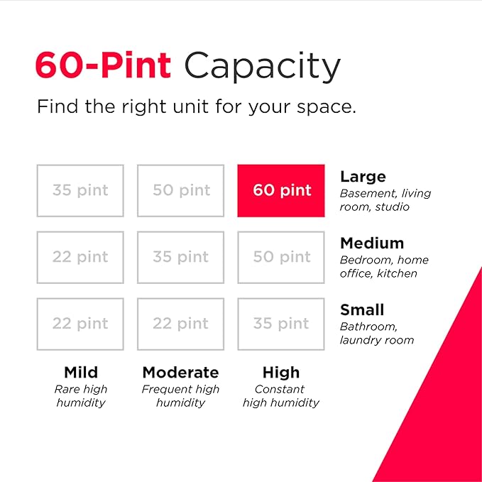 - Convenient Drainage Options: Choose from three hassle-free methods – the built-in pump for upward moisture discharge into a sink or out of a window, the easy-carry water bucket for manual removal, or the continuous drain option to skip emptying the bucket