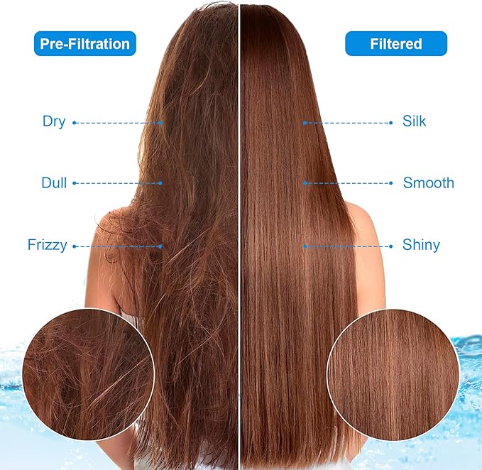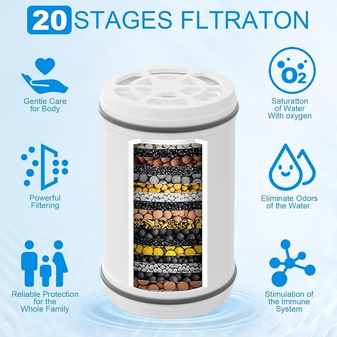 - 20 Stage Shower Filter: The purifier contains a variety of filtration materials, KDF-55, Calcium Sulfite, Vitamin C Balls, etc. to minimize chlorine and heavy metals in the water, which softens the bath water and reduces hair and skin dryness
