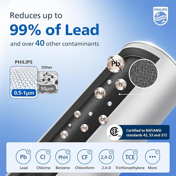 - ā NSF/ANSI Certified Filtration: Electric water filter pitcher engineered with a proprietary activated carbon block filter meeting NSF standards 42, 53, and 372, the PHILIPS Instant Plus filter reduces 46 impurities, including chlorine, lead, mercury, benzene, and bisphenol A (This system DOES NOT lower TDS value. If you prefer low TDS value, please consider PHILIPS RO system.)