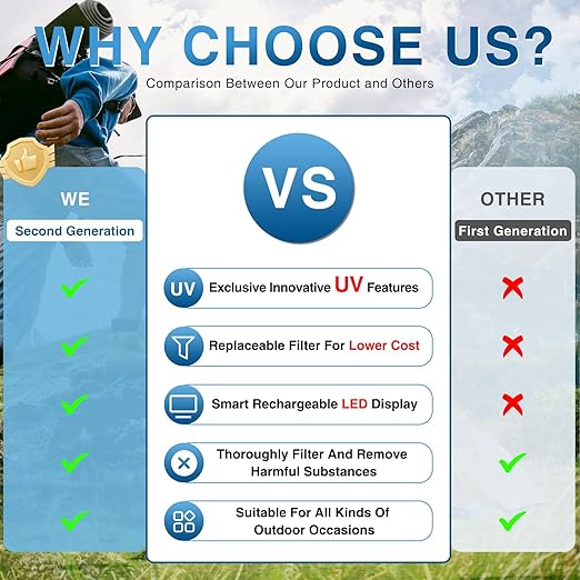- Unlimited Use: Built-in special filtering function, high-quality display intelligent observation filter effect, innovative use of replaceable ultrafiltration membrane and activated carbon design, to solve the problem of cleaning and preservation after use. The straw and activated carbon parts is replaceable and it is simple and convenient, and the activated carbon parts are recommended to replace one after each trip, camping, hiking and other activities.