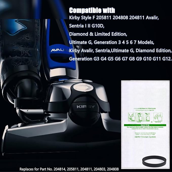 - 【Compatible model】16 pack 204814 vacuum bags plus 2 pack belts Compatible with Kirby Style F 205811 204808 204811 Avalir, Sentria I II G10D, Diamond & Limited Edition, Ultimate G, Generation 3 4 5 6 7 Models,Fit for Kirby Avalir, Sentria, Ultimate G, Diamond Edition, Generation G3 G4 G5 G6 G7 G8 G9 G10 G11 G12,Belts included part 301291.