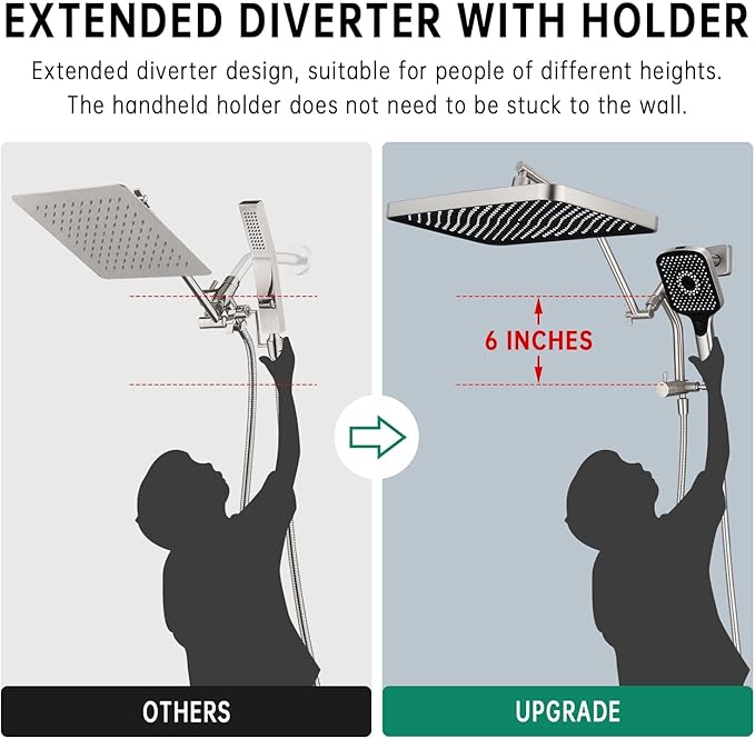 - UNIQUE METAL EXTENDED DIVERTER WITH HOLDER: The unique metal extended diverter switch allows you to adjust the mode without having to lift your arm hard. The handheld shower holder does not need to be glued to the wall, it is convenient to reach the handheld device. G1/2 universal connection for most standard U.S. bathroom plumbing