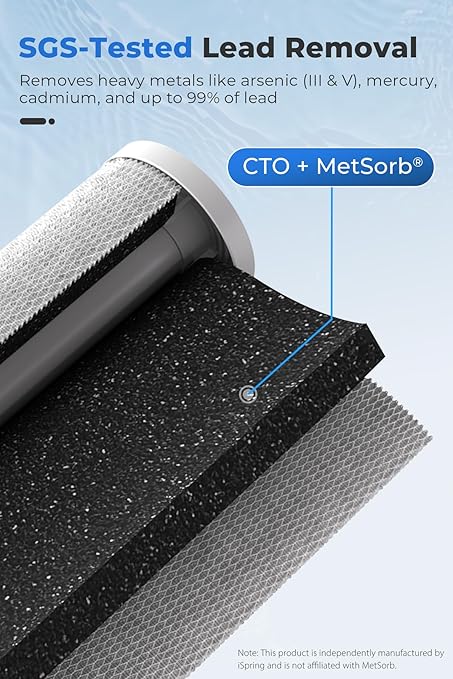- Comprehensive Heavy Metal Filtration: Featuring advanced MetSorb media, our system efficiently removes heavy metals like arsenic (III & V), lead, mercury, cadmium, and more. This superior filtration extends the lifespan of the filter, reducing replacement frequency. (Note: This product is independently manufactured by iSpring and is not affiliated with MetSorb.)