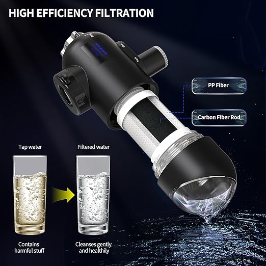 - Innovative UV Blue Light Technology --- Equipped with UV blue light to enhance water purification. Unique turbine magnetic field sensor generates kinetic energy through water flow without the need for batteries. Combination of advanced technology and exquisite design. The display is powered by the hydroelectric power system, which only operates in the filtered water mode. (Suitable for Water Pressure Range: 0.1Mpa-0.4Mpa)