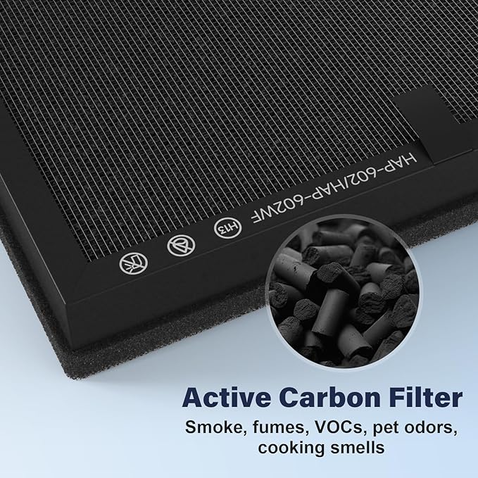 - HAP602 replacement filter features 3-Stage Filtration System: ①Fine Pre-Filter ②Efficient Middle Filter ③Activated Carbon Filter, That filters out a wide range of airborne contaminants such as pet fur, dander, and more
