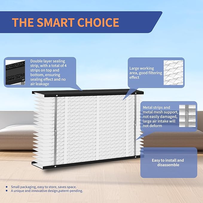 - Revolutionary innovative design (patented):The unique foldable design,by using 4 bendable metal strips, the filter can be easily folded and unfolded, Replacing, installing the filter is a breeze. It also provides good support under high air intake and can be easily stored when not in use. By using four sealing strips on top and bottom, the amount of air bypassing the filter can be minimized to provide better sealing effect.