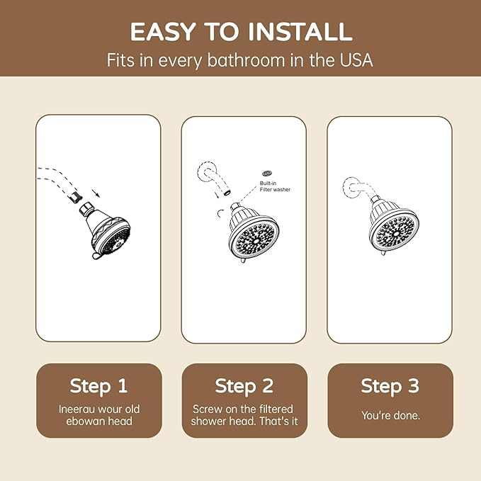 - Shower Head with Filters Easy Installation:No-Leaks and Rustproof filtered shower head for shower systems attaches to any ½-inch pipe in less than 1 min,No tools needed! To ensure performance usage, replace the filter every 6 months . This ensures continuous protection against hard water, chlorine, and skin-damaging contaminants.
