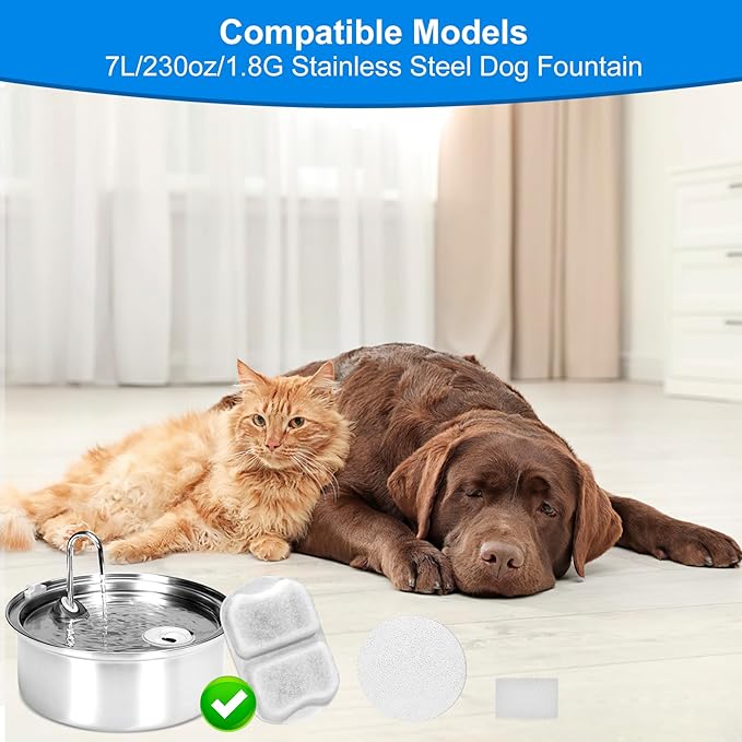- Compatible - The cat water fountain filters are compatible with oneisall 7L/230oz/1.8G stainless steel dog water fountain. Please check whether it is compatible with your cat water fountains before purchasing to avoid purchasing errors.