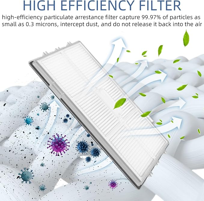 - 【EFFICIENT CLEANING】5-Arm side brush improves the efficiency of dust removal, and the soft material can take care of corners, close to walls and crevices to ensure a completely clean area. High-efficiency particulate arrestance filter captures 99.97% of particles as small as 0.3 microns, intercept dust and does not release it back into the air.